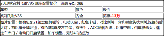2019款宾利飞驰V8S店内现车充足在售,车型颜色多选,配置款型丰富,车辆座位数分(4座、5座),认证进口资质,宾利飞驰V8S一手贸易商拒绝中间加价。现本公司以与多家大型国企银行合作,专业办理分期贷款业务,首付30%,批款流程比较快捷。近期,更有大型优惠活动即将来临,详情咨询文章底部经销商。
