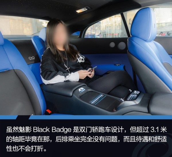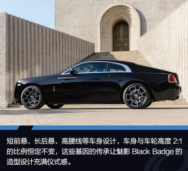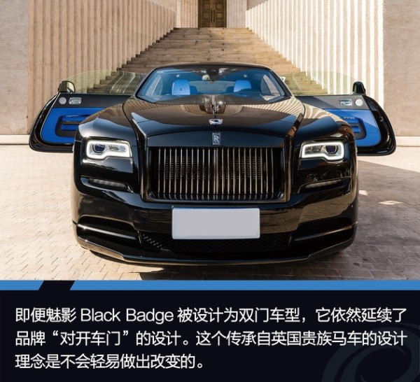 魅影系列是劳斯莱斯品牌中,最年轻化、最具驾驶品质的车型。不过,即便是有着“溜背”造型,双门设计的老款车型也带有相当浓郁的庄严感。魅影Black Badge运用了大量突破性设计,将传统的“欢庆女神”立标变为黑色,徽标全部采用“银底黑字”的反转设计。能看到几乎所有装饰部件都采用手工抛光处理,最终呈现出高亮光泽的“黑色”质感。