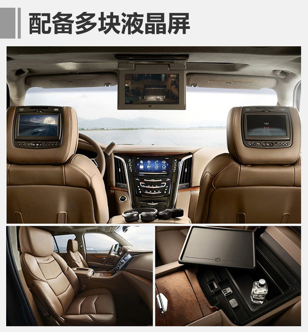 内饰方面,凯雷德长轴白金版采用全新的Nappa真皮座椅,并在多处配以Alcantara材质与木纹装饰,同时仪表盘与中控台也将进行调整。除前排座椅后方两块7英寸液晶显示屏外,还在车顶处配以12英寸显示屏,此外,新车还配备360度全景摄像头、前排18向电动调节座椅等配置。