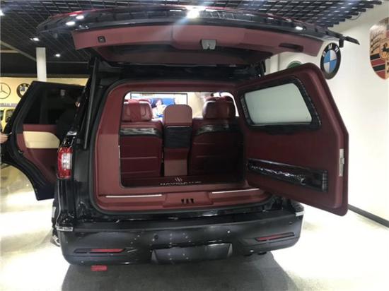 8款林肯领航员领袖一号3.5T后舱内饰;整车采用4+2座椅分布,2个电动隐藏座椅+中央电动吧台组合,可以成为一个 小型会议室,地板是高级柚木地板,中间镶嵌铜条,手工制作,方便打理,2个总统按摩座椅可以加热通风,可以180度放平。