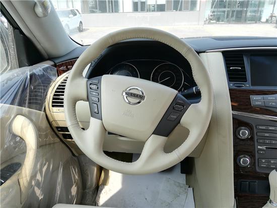 2、日产途乐Y62中东4.0采用了豪华轿车惯用的四幅风向盘设计,粗细比较合手再加上真皮加实木的用料,手握感觉极佳。