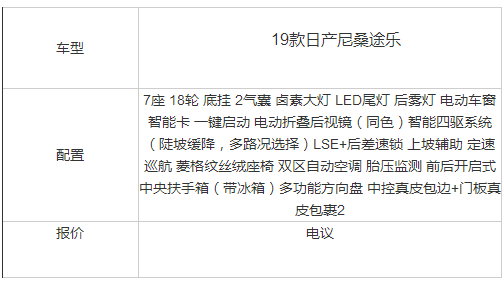日产尼桑途乐搭载直喷自然吸气发动机,带有VVEL连续可变气门升程控制以及C-VTC连续可变气门正时控制系统,最大功率398PS,峰值扭矩555Nm,传动匹配7速自动变速箱。