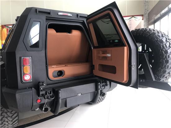 乔治巴顿越野车在外观造型上刻意突出了威猛的形象,车身覆盖件设计得粗犷而充满张力,突出的前灯、尾灯、车门把手、牵引钩以及大面积的镀铬装饰条更强化了这种感觉。裸露的铆钉和垂直的边角线条,要的就是这种霸气范,前部车灯造型可以用古典来形容,简单的造型甚至会让人误有上世纪八十年单车型的错觉。