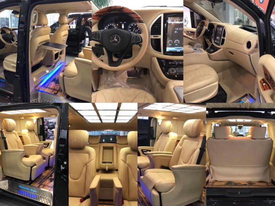 进口奔驰麦特斯商务车配置:17寸铝合金多幅轮毂,Turbo双排气系统,定制空气扰流组件,车顶行李架,奔驰镜面中网,侧边进气鱼鳃,日间行车灯系统,新款组合头灯,高级礼宾双侧电动滑门,外观镀铬装饰,加强车身防撞系统,双电瓶,外接电源系统,全车碳纤维内饰,全车内部手感漆套件,NAPPA皮革,手缝双线仪表台,鹿皮绒内饰,车载吸顶15.6寸环绕音响系统(可投屏显示)头等舱8项智能座椅(含加热通风按摩旋转)12.1寸超大导航系统(含手机互联)车载充电电源220V,阿尔卑斯牛毛地毯,前后独立空调,车内氛围灯系统,镀铬踏板带氛围灯,全车窗帘,车载小桌板,太空星空车顶(元宝星空顶)车载冰箱,正副电动座椅,副驾驶老板按键。