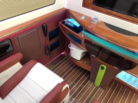 奔驰斯宾特内饰全体采纳柚木地板、入口Nappa真皮和Alcantara毛皮面料包覆座椅和车顶,米红色的色彩加星空顶气氛灯凸显“家居”舒适之感。多功能推拿座椅、暗藏挪动茶几,暗藏式伸缩电动桌板和高清液晶电视等设置装备摆设尽显科技带来的欣喜。
