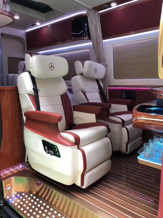 奔驰房车旅居斯宾特保姆车最低多少钱128万起、前两座有通风,加热和按摩功能,还有旋转360度功能,当他旋转至后排对面是,座椅中间可以装上餐桌,你们就在可在上面玩纸牌,聊天,品茶等娱乐功能。最后一排可以直接放平睡觉,座椅的柔软性很好,绝不比你家里的大床睡觉差哦。d