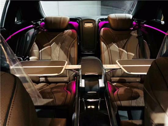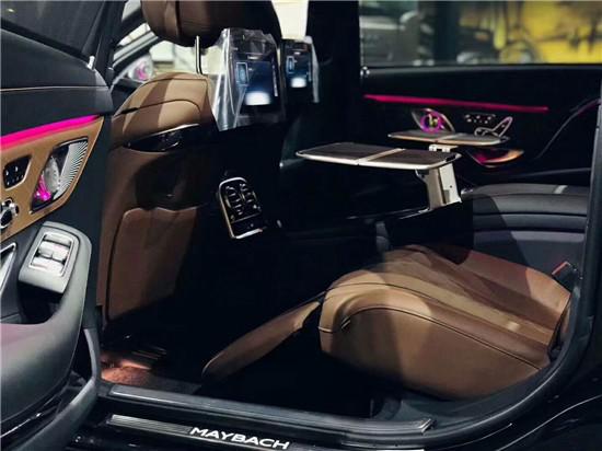 新款奔驰迈巴赫S560后排空间十分宽敞,两个独立座椅的设计保证了乘坐的舒适性,并且后排两个座椅中间的扶手箱,在能倚靠的同时拥有了一定的储物空间,此外还带有两个小桌板,供后排乘坐的老板办公使用。
