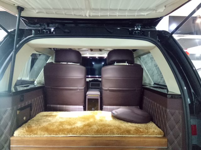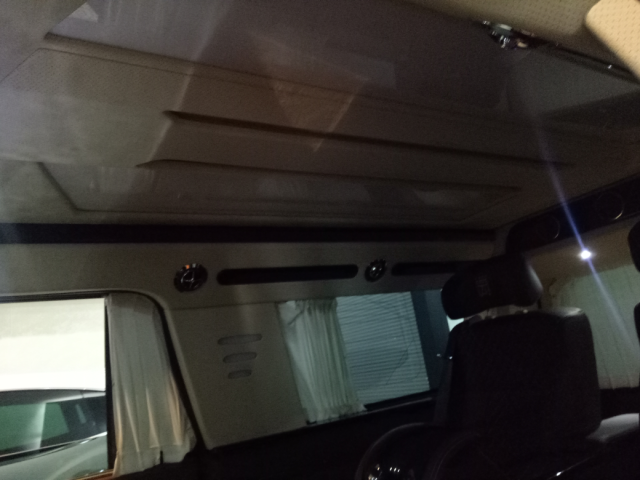 全车自吸防滑地毯 前后升降隔断 乘客区方格式车顶灯 强化全车隔音降噪 铝合金电动升降桌板