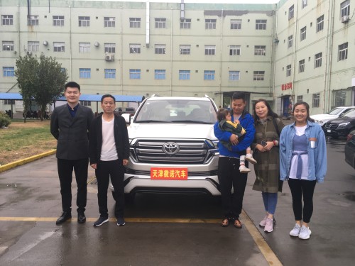2019年4月28日早上内蒙古肖总带着一家五口人坐飞机抵达天津机场,一路很顺利上午选好车型定好车架号,酷路泽5700白色中午把车送到改装厂办理内饰升级,下午办好临时牌照天津-陕西-内蒙古,与2019年4月17中午验好车准备出发,一家五口拍照留念全家露出满脸的笑容。