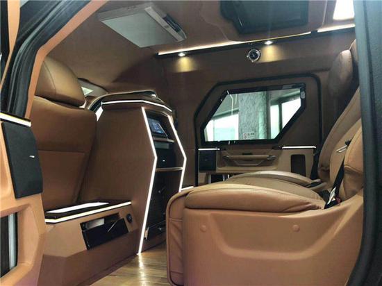 乔治巴顿越野在外观造型上刻意突出了威猛的形象,车身覆盖件设计得粗犷而充满张力,突出的前灯、尾灯、车门把手、牵引钩以及大面积的镀铬装饰条更强化了这种感觉。18款乔治巴顿越野内饰采用了双色混搭,座椅纯手工缝制,看上去非常舒服,有着一种优雅古典的格调,特别是驾驶舱内有夜视系统、卫星导航、防生化毒气系统、供氧设备等安全设备,还有多媒体影音视讯系统、高科技卫星侦测系统。