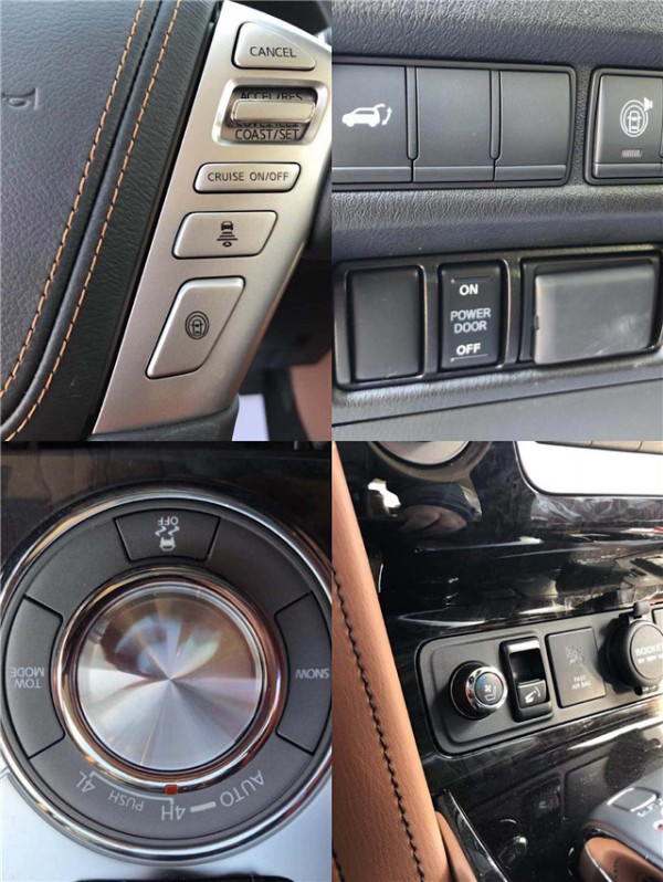 庞大的身躯和巨大的进气格栅都成为夺目的亮点,改款后的QX80车灯发生明显变化,头灯短小精致,尾灯线条锋利同时以LED作为光源,看上去更精神更年轻,新款的20寸轮毂更显运动,除了这些改变和细节的修饰以外,并无太多改款的地方,新款车型感受还是和老款如出一辙。