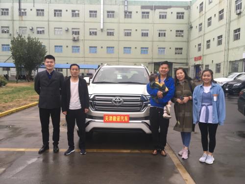 天津港保税区丰田专卖2019年4月28日早上内蒙古肖总带着一家五口人坐飞机抵达天津机场,一路很顺利上午选好车型定好车架号,酷路泽5700白色中午把车送到改装厂办理内饰升级,下午办好临时牌照天津-陕西-内蒙古,与2019年4月17中午验好车准备出发,一家五口拍照留念全家露出满脸的笑容。