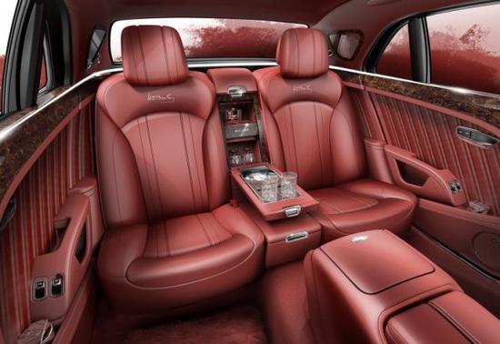 新车采用了复古皮革进行内饰包裹,选用复古火红色(Fireglow Heritage)以及现代宾利车型可选用的火红色(Fireglow)真皮饰面,完美搭配鲸鱼黑(Beluga)真皮饰面装饰细节与缝线,诠释了宾利8升的经典内饰风格,并在座椅头枕上以刺绣手法呈现了宾利先生的签名。仪表盘饰板和方向盘采用深色哑光胡桃木(Dark Stained Burr Walnut)打造而来,在后排扶手后方由Mulliner部门打造的具有灯光效果的鸡尾酒储藏柜非常精致,此外,典藏版慕尚车型配有火红色(Fireglow)羔羊毛地毯、精制平底玻璃杯、后窗私密遮帘,以及后排信息娱乐系统。