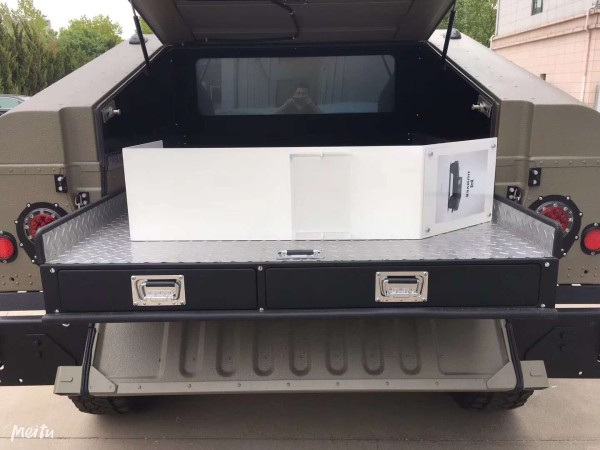 后斗全部用实木进行包裹,视觉感受相当不错,把后斗打开,铺个床垫就能睡午觉了,这空间绝对没得说,方向盘更换为了momo的赛车方向盘,中控台还是充满了浓浓的军车气息,坐在里面感觉像是在开坦克,基本功能都在这个区域,不过操作还是得习惯一阵子,不过令人颇感意外的是,Humvee C竟然装配了360度倒车影像,越野车必备的两个档把,点烟器和USB口齐备。