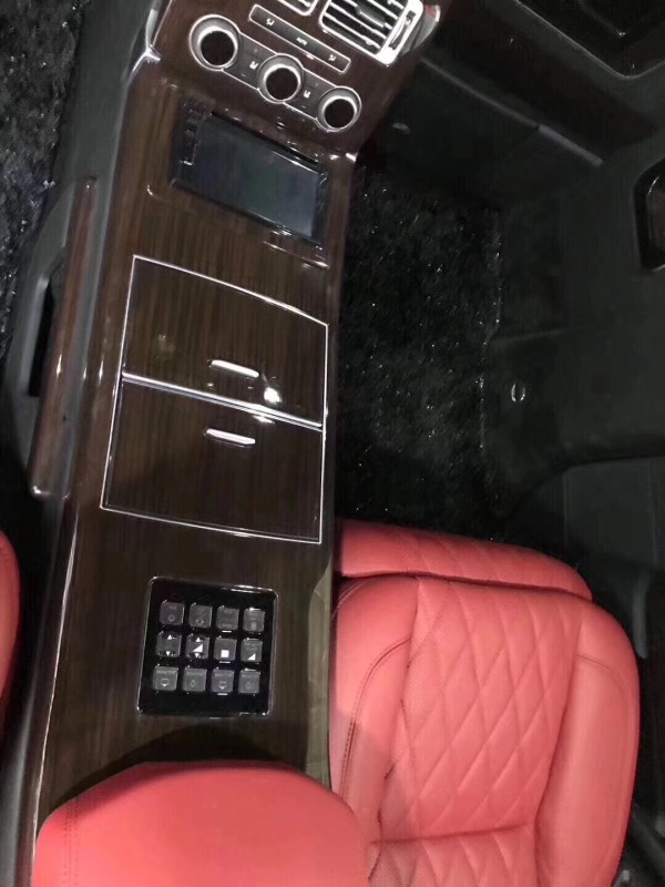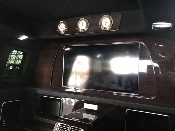 路虎揽胜皇家一号加长版前方座椅加热带按摩功能,车载冰箱一应俱全,由于车比较长,所以配备了前后对讲功能。路虎揽胜皇家一号加长版车内配有一个类似于KTV似的吧台,带蓝光SONY牌DVD,索尼高清LED电视,以色列卫星天线,以及空气净化器,车内带氛围灯。