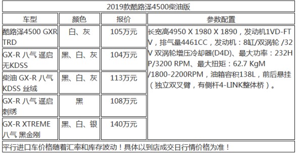 丰田酷路泽4500柴油版搭载V8双涡轮增压发动机,双油箱、双备胎、双电瓶,综上所述丰田酷路泽4500柴油版已经作好去极限越野的全部准备。悬架的弹簧和减震器进行了优化,使其在拥有更强动力的同时,操控性能更为卓越,兼顾了不同路况的驾驶舒适性。