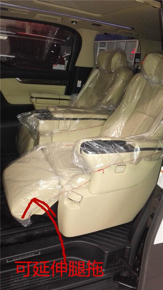 埃尔法的重点就在于它的第二排,堪比飞机头等舱的座椅享受,让你忘掉驾驶的乐趣,尊贵版的座椅比豪华版的更宽大,并且有独立的手枕操控区,更是配有杯架,小桌板,而且腿拖还可以加长(豪华版也有腿拖,但是不能延伸加长)。话不多说,直接上图:
