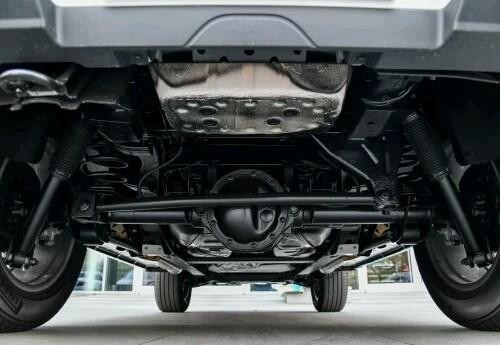 底盘方面,非承载式车身结构,前双叉臂后整体桥,配全时四驱,滤震感觉比较硬朗,新款相比老款而言要软了不少,但依旧有很清晰的路感,支撑力道十足。前中后的三把差速锁,基本上能让它逢山开路遇水平趟。