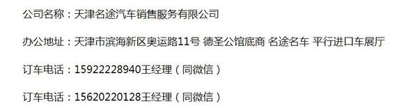 喜欢这款车或者打算购车的朋友请拨打下方电话或者添加本人微信,微信朋友圈每天更新大量平行进口车新车上市,配置、报价、图片。您购车有任何不解问题,天津平行进口车专卖,我会第一时间为你解答。我们的优势:车辆可享受全国质保,保修,包换,包退,我们有多年为客户服务的成功经验,为您提供合适您的最佳方案。承诺:本店所售车辆为全新未改动车辆、正规手续、符合全国上牌标准,我们不做市场最低价,低了没保障,不做最高价,高了没感情,只挣我们该挣的钱,只交该交的情,认真做事,合作共赢,和我们合作不敢保证你花最少的钱,我敢保证让你省最大的心,得到质量,效率、利益、共赢局面,期待每一位新老客户的合作!用心服务、传递信任!我愿与您长期合作!