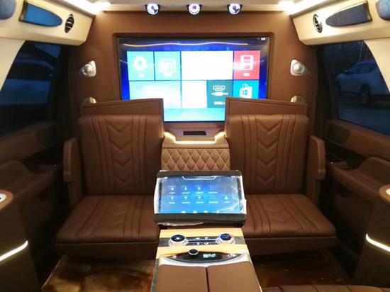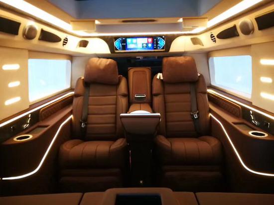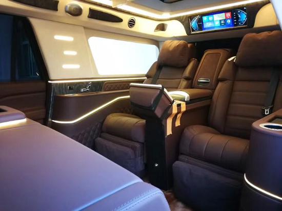 打开林肯领袖一号的车门,首先映入眼帘的是两只航空座椅和中间隔屏,32寸高清超薄升降电视,环绕式BOSE音响,更有与吧台相结合的两个隐藏式座椅。
