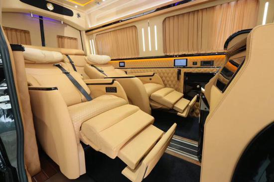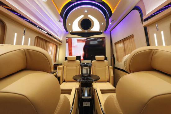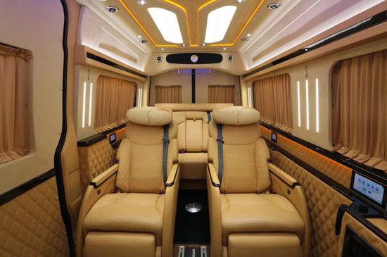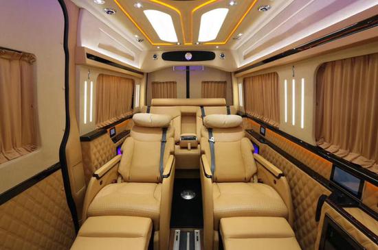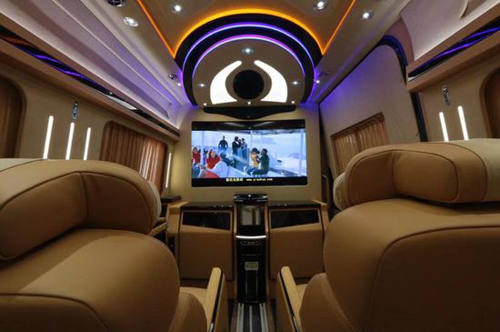 改装后的奔驰斯宾特让房车内饰的豪华高档,超大曲屏电视、咖啡、星光灯,配以多功能航空座椅、沙发床及5.1BOSE立体声道环绕音响系统!