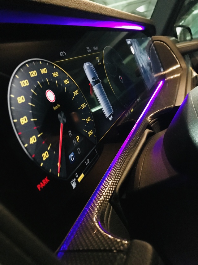 越是经典的设计越难做出改动,或许就是因为G级太过经典,以至于新车外观最明显的两处改动总是给我感觉怪怪的,其中一个是大灯,圆形头灯让我又爱又恨,爱的是它的几何多光束LED大灯能在弱光条件下,实现更好的照明效果,恨的是环状的LED日间行车灯让它看起来有些呆萌,跟自身的硬汉形象不搭。