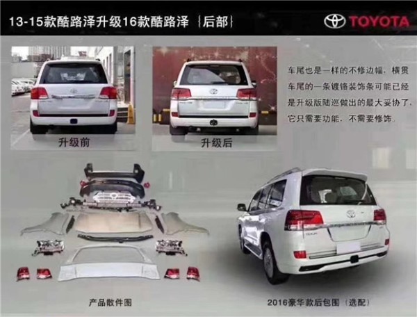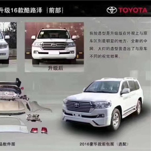 丰田兰德酷路泽其实又叫“陆巡洋舰酷路泽这款车呢它世界上公认的越野车王者,有句话叫:“开不的丰田,修不好的路虎”。这里所说的开不的丰田就说的兰德酷路泽世面上老款酷路泽有多,有些人又不想换车,因为这款车毫不夸张的说开十年都不成问题,没必要去换新车,所以呢多人就在外观上花功夫这次换的套件基本外观全部更换,前杠 中网 叶子板 灯 机盖 后杠 后尾门 后灯外形整体变动了很大变化,原车中网单一,大灯前面有1块菱角,看起来让人有点别扭,而改动后的前脸部分连灯,中网都一起改动了,所以改动后的部分呢看起来硬朗,而且灯与中网之间呢有一块分隔线条,这样才能凸显出新款的整个运动风格,不换机盖装不上前杠 也装不了叶子板 硬伤!可能大家会问改了新款,耽误装踏板吗?那么我告诉你完全不耽搁,因为改的话侧面不用做大改变,主要改前后前后而已,灯与机盖,前杠之间呢已经百分百吻合,完全没有缝隙。而且灯需要把原车的先拆掉,在一根一根的换成这个新款灯上。