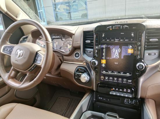 19款道奇公羊长角号皮卡在内部设计上还是延续了美式那种比较粗犷的风格,规整的中控台设计看上去比较死板,但丰富的配置会让你不由得为其称赞。中控台的设计简洁硬派,符合公羊的气质。仪表盘底边有花纹,则更加凸显了这款车的文雅性。软性材质的仪表台设计,摸上去手感非常舒服,并无些许生硬之处。