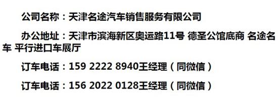 喜欢这款车或者打算购车的朋友请拨打下方电话或者添加本人微信,微信朋友圈每天更新大量平行进口车新车上市,配置、报价、图片。您购车有任何不解问题,天津平行进口车专卖,我会第一时间为你解答。我们的优势:车辆可享受全国质保,保修,包换,包退,我们有多年为客户服务的成功经验,为您提供合适您的最佳方案。承诺:本店所售车辆为全新未改动车辆、正规手续、符合全国上牌标准,我们不做市场最低价,低了没保障,不做最高价,高了没感情,只挣我们该挣的钱,只交该交的情,认真做事,合作共赢,和我们合作不敢保证你花最少的钱,我敢保证让你省最大的心,得到质量,效率、利益、共赢局面,期待每一位新老客户的合作!用心服务、传递信任!我愿与您长期合作!