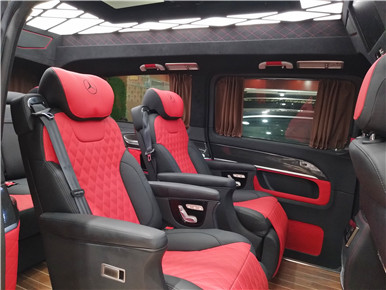 内饰配置: 真皮多功能方向盘 中控13.4寸彩色液晶集中控制显示屏(GPS导航,倒车影像,收音机,USB播放,上网功能,手机互联) vclass原装扶手箱,折叠式冰箱盖11L,后部储物盒,usb接口,220v电源接口 豪华一体式中央扶手箱(内置11L冰箱) 全车座椅意大利顶级Nappa真皮 MERCEDES-BENZ不锈钢踏板套件 12V电源借口 可拆卸式版桌板