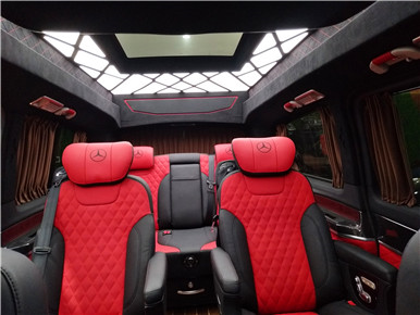 外观配置: 尊贵镀铬套件 vclass原装前脸大包围 氙气大灯 防紫外线隔热隐私玻璃 双侧电动滑门 上掀式尾门红色搭配边缘线
