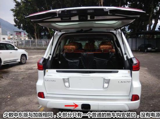 3、正后方:加版车尾部带一个凸起的方形盖板,打开后里面是拖车钩孔位和拖车电源。少数中东版与加版相同,大部分只有一个普通的拖车钩安装口,没有电源。另外中东版的SPORT PLUS版后尾门上带有SPORT PLUS字母标。
