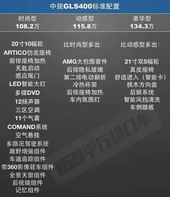 中规GLS400已新增了最低型号——时尚型,仍比美规基础型多了一堆东西,包括自动泊车这种鸡肋,导致起步要108万元,还是不加价的前提下。