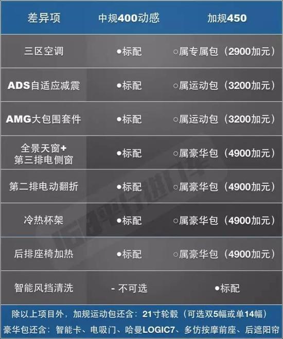写成等式的话,就是:中规400动感标配 =加规450标配 + 三区空调 + 大半个运动包(除21轮) + 半个豪华包。