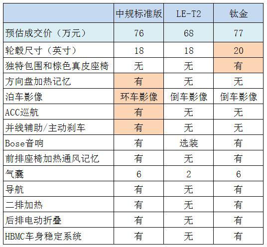 以上表格为中规标准版和中东LE-T2和钛金版配置对比,中规标准版除轮毂仅有18英寸,也没有特殊的包围和棕色真皮座椅外,配置还有环车影像和安全配备的优势。