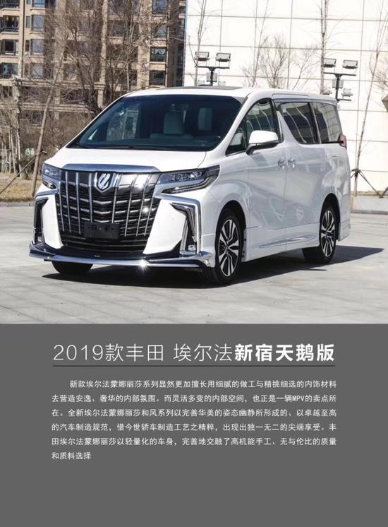 2019款丰田埃尔法蒙娜丽莎,新硕天鹅 丰田埃尔法逐浪版、和锦版、樱花版、墨麟版全系接受预定,丰田在奢华商务MPV商场将握有愈加杰出的优势。2019款全新埃尔法蒙娜丽莎以完善华美的姿态幽静所形成的、以卓越至高的汽车制造规范,借今世轿车制造工艺之精粹,出现出独一无二的尖端享受,轻量化车身,完善地交融了高机能手工、无与伦比的质量和质料选择,我们不做市场最低价,低了没保障,不做最高价,高了没感情;只挣我们该挣的钱,只交该交的情,认真做事,合作共赢,和我们合作不敢保证你花最少的钱,我敢保证让你省最大的心,得到质量,效率、利益、共赢局面,用心服务、传递信任!期待每一位新老客户的合作!详细价格和具体信息请咨询文章下方销售电话。