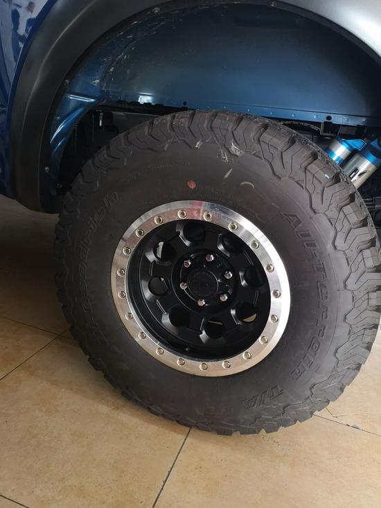 18款福特猛禽 3.5T的轮毂最为独特,新车最新的轮毂是把可靠的传统轮毂和防脱圈的轮毂结合起来了。这款防脱圈轮毂可以保证在轮胎气压较低的情况下,轮胎不会脱离轮毂,因为我们去沙漠的时候往往要降低胎压。并且它从传统轮毂转换到防托圈只需要客户拔去标准螺栓,从其常规位置卸下轮胎然后从可锁位置重新安装轮胎,再装防脱圈螺栓即可。