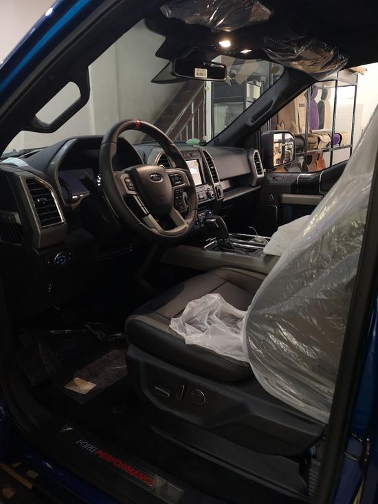 18款福特猛禽内饰采用独特的中控台和门饰板面漆和真皮包裹的方向盘。中控台部分辅以银色饰板装饰,六指针仪表盘的设计有些后工业时代的复古风格。采用带电冷热功能的可记忆式皮革座椅,头枕四向可调,搭配铝饰条和黑色钢琴烤漆内饰。可电动升降的后窗带隔板和电热除霜功能。进口18款福特猛禽皮卡真皮座椅包裹性很强,无论是越野还是长途旅行,都很舒服,丝毫不感觉到这大家伙的压抑,二排空间也是十分宽敞,乘坐四个身材高大的乘客绝对没问题。座椅折叠起来可以放一个冰箱,而且门上储物格空间也是够用,虽然不像公羊后排那么豪华,有简易床,但是这种实用的理念就是福特的宗旨。