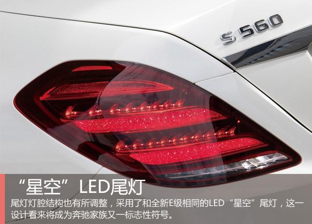 新奔驰S级前大灯进行了升级,配备了新E级高配车型配备的最新MULTIBEAM LED大灯系统,灯腔内多达84颗独立LED光源,可根据路面实施情况以及实际照明需求,对每颗LED进行单独控制,照明距离达到650米。LED日行灯也变更为“三道杠”,更具辨识度;尾灯灯腔结构也有所调整,采用了和全新E级相同的LED“星空”尾灯,这一设计看来将成为奔驰家族又一标志性符号。
