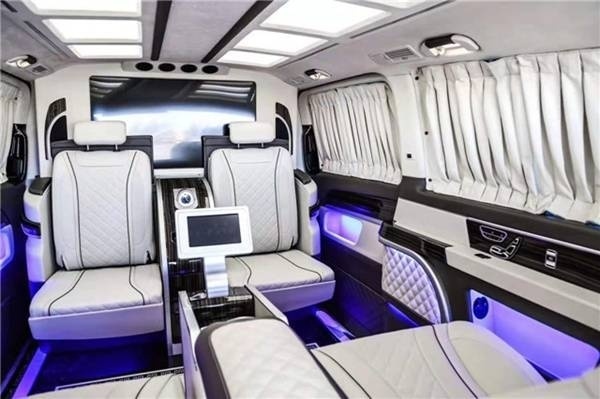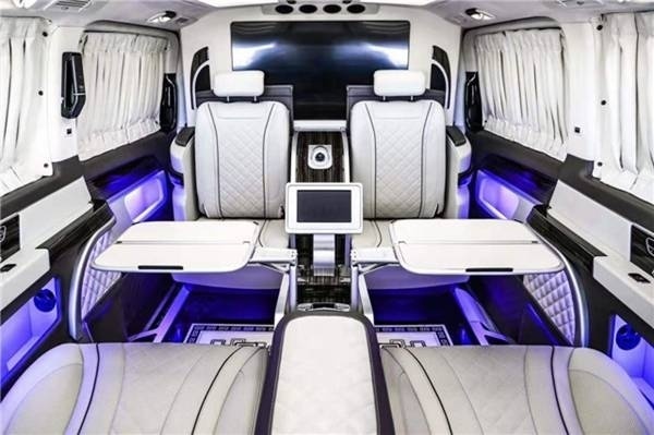 后仓高端液晶操控台,支持按键和触屏更有语音控制系统,更有逼格更有范儿了!整车的内饰配件都采用模具化生产,方便维修减轻车的重量,确保配件的供应,全车线束特约德国奔驰工厂线束专家研发设计,与改装车的私接乱改有所不同,使车辆更加安全,无后顾之忧!室内配有左右两侧电动隐藏办公桌板,iPad互联电脑、室内声控电动控制系统,电动窗帘、隐藏迷你保险柜、迈巴赫顶灯,所有饰条选用泰国珍稀树种虎斑檀木,工艺为实木纹贴皮,工艺精细,优雅高端大气,地板选用古巴影木全铝地板,不易变形坚固耐用,地板拼花为激光雕刻而成,极具现代奢华感。