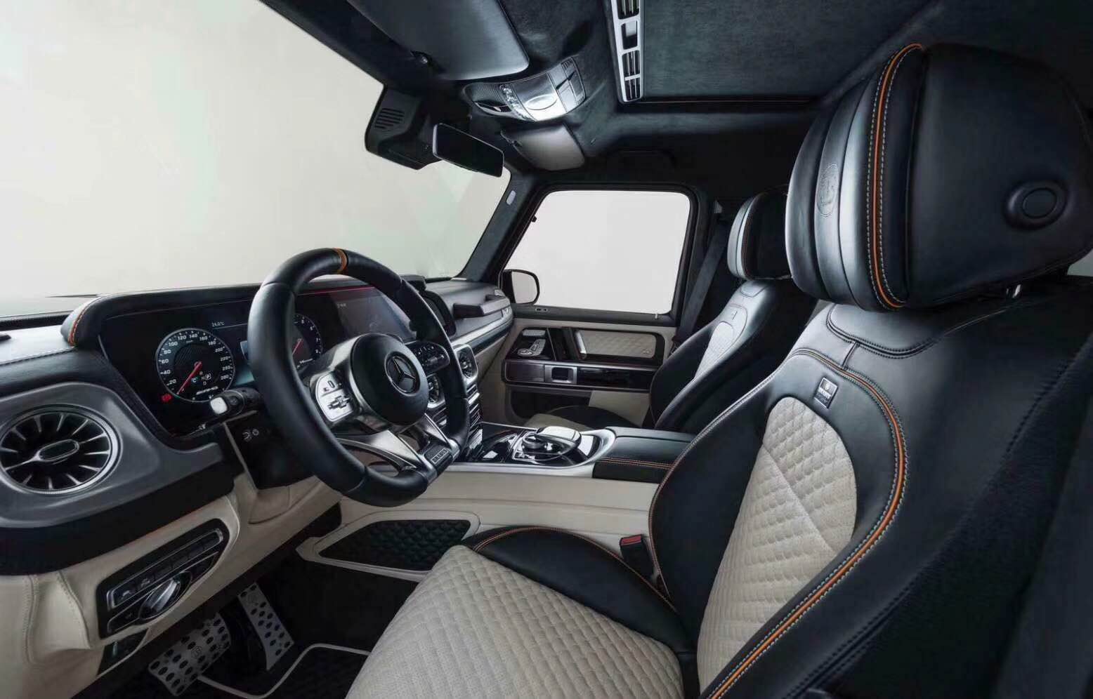 相对于老款的奔驰G来说,档次、质感和科技配置都明显提升全新奔驰G级的内饰相比老款有了明显的提升,采用了奔驰最新的双屏幕式设计,全液晶仪表盘和中控台屏幕都达到12.3英寸。同时内饰质感和工艺都有了很大的进步。较之于现款车型,它的内饰发生了巨大的变化,融入了不少现款奔驰S级、E级的设计元素,从而变得更加豪华,而家族式的连屏设计则凸显了车内的科技感。当然了,经典的“三把锁”按键自然不会缺失,并且设置在中控台最为显眼的位置。