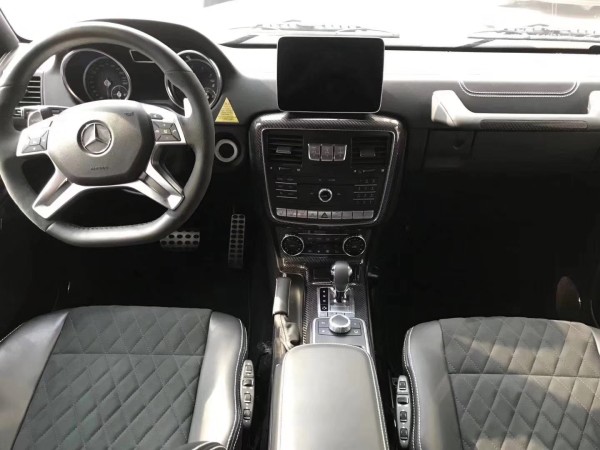 从内饰来看,新一代G级使用了奔驰品牌最新的家族式设计元素,包括仪表盘、中控显示屏、空调控制区、COMAND操作区和带有双拇指控制(Dual Thumb Controls)的三辐式方向盘等。中控台上的“3把锁”、副驾驶前方的扶手等G级经典的设计元素在新车上均得到保留。中控台功能按键盘设计比较紧密,但是做工精细。中控台配置COMAND信息娱乐系统和一个8英寸大尺寸液晶显示屏。