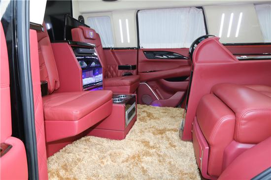 凯迪拉克总统一号选用高级德国Napa真皮航空座椅带加热及气动按摩,舒适腿托,4区域高级气氛灯,7寸智能中央控制触摸屏,控制后舱所有电子及电动设备,高级隐藏式秘书座,33升大容量压缩机式顶级冰箱,智能手机无线充电设备以及USB充电和110-220V供电插座。