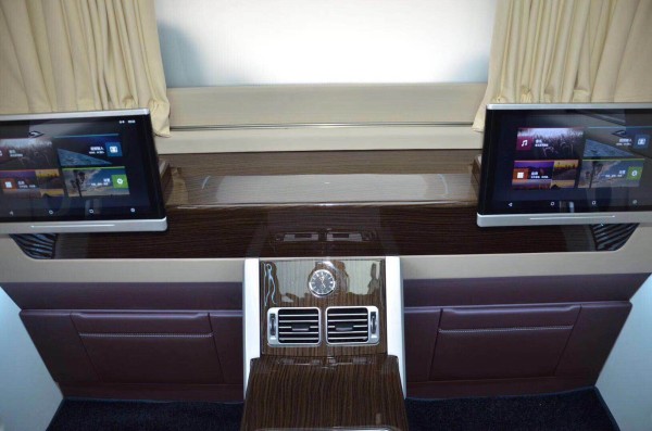 路虎揽胜皇家一号加长版配备了BOSE5.1殿堂级影院系统,喝酒K歌绝对毫无压力。后排配备有鞋托,车内底板全部为豪华游艇木装饰。由于是4座的设计,所以说后备箱腾出了比较大的空间,说到底,加长路虎揽胜皇家一号,还是一个豪华商务越野车,最主要的功能设计都安排在了后排。