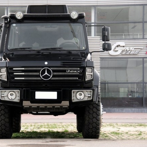 外观设计:乌尼莫克U5000整部车的中网采用了三条银色的装饰条组成,中间的奔驰LOGO显得格外的亮眼,或许只有这个方面能让我们看出这是部奔驰车了!两侧的大灯采用了竖排的LED光源并且为了腾出更多的中网,镶嵌的位置也更加靠近两侧!两只炮眼式的尾灯还是非常的霸气!尺寸上它的长宽高分别为5300mm/2350mm/2850mm,轴距达到了3250mm。超高的离地间距使得登上这款车犹如上了两个台阶!