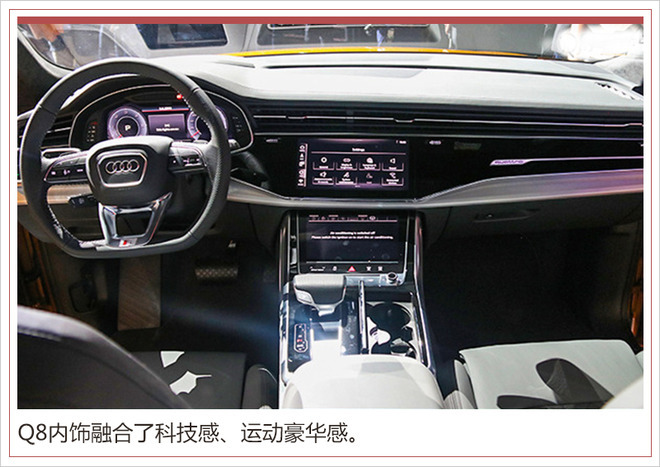 内饰方面,Q8较少用到物理按键,起自仪表的空调出风口一直向外延伸至车门,一气呵成。仪表盘为12.3英寸液晶显示屏,中控台上下两块屏幕(上方10.1英寸,下方为8.6英寸)加入触摸功能,提升科技感。运动方向盘多处加入镀铬元素。运动座椅增强了包裹性,宽大的后排空间采用三座设计。