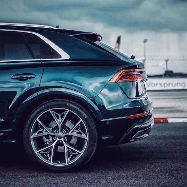 车身侧面采用了Coupe式造型,C柱与水平线的夹角锋利,营造出跑车的姿态。大尺寸双五幅造型轮圈外侧轮眉十分具有肌肉感。对于一台比Q7还要大一号的SUV车型来说(奥迪Q8长4986毫米、宽1995毫米、高1705毫米,轴距为2987毫米),Q8侧面造型可谓秀气。