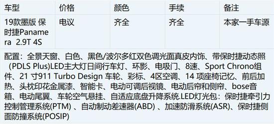 19款保时捷帕拉梅拉2.9T 4S动力参数:保时捷(平行进口)级别:豪华车长*宽*高:5050*1938*1422MM 最高车速:179 轴距:2949 整备质量:1870 油箱容积:90L 进气方式:双涡轮增压 气缸排列方式:V6 每缸气门数:4 压缩比:10.5 配气结构:DOHC 缸径:84.5 行程:86 最大马力:446 最大功率:328 最大功率转速:5650-6600 最大扭矩:550 最大扭矩转速:1750-5500 变速箱:8挡手自一体双离合变速箱驱动方式:前置四驱四驱形式:全时四驱中央差速器结构:多片离合器前悬架类型:双摇臂独立悬架后悬架类型:多连杆独立悬架车体结构:承载式驻车制动类型:电子驻车。