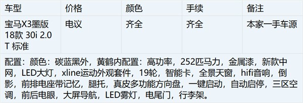 2018款宝马X3的外观个性动感,车身侧面比例优雅,从车顶滑到车后部的线条流畅柔和,凸现轿跑车的动感轻盈。后座椅靠背可折叠,使行李箱空间容量由570升扩大到1450升,让您的旅行完全没有后顾之忧。宝马X3让人们瞬间点燃热情,修长的侧面线条与低座舱相得益彰、经过明显强化的车轮尽展强悍风采、经典的双门轿跑车比例、豪放而凹凸有致的表面、以及融入强劲后端的后掠车顶线。宝马蓝白相间的标志代表着高速旋转的螺旋桨,更蕴含着人类追求极致速度的梦想。