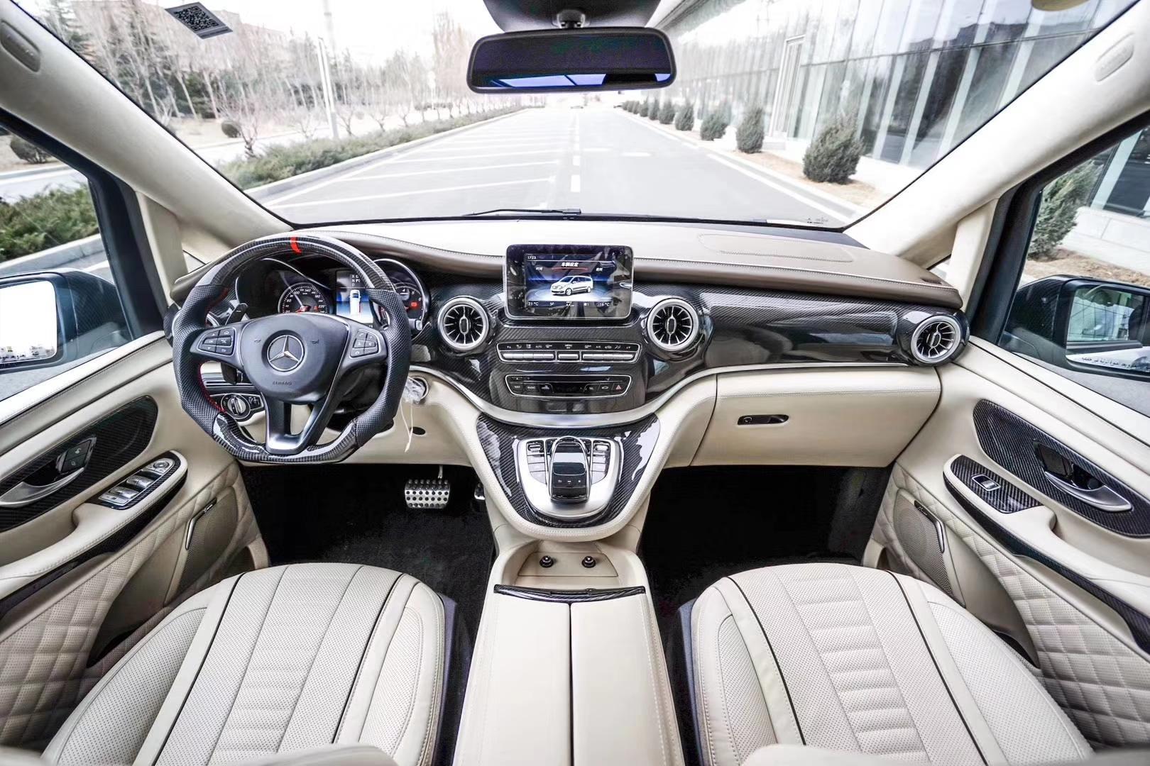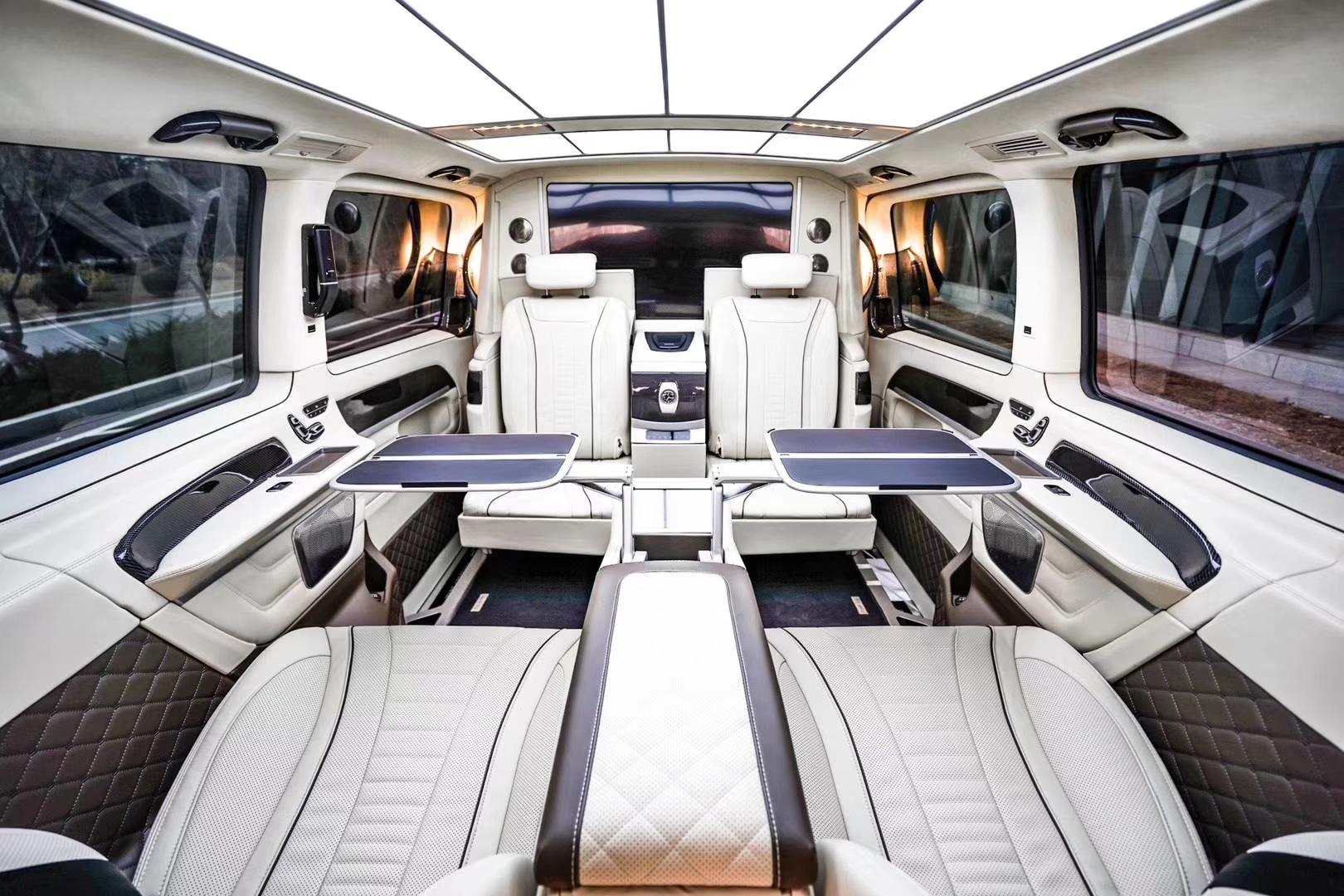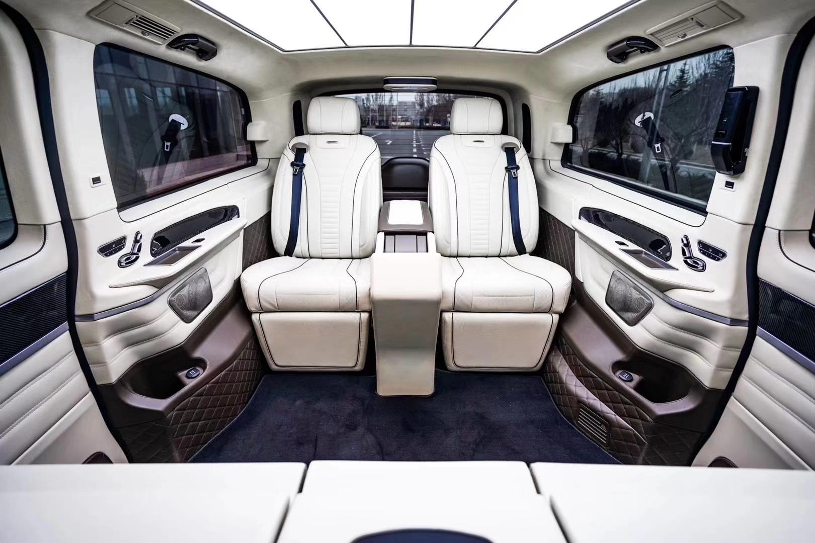 进入奔驰V250后舱,立刻就会被它的豪华绚丽而征服,驾驶舱与后舱是分隔设计的,形成两个独立的空间。中间由一台超大液晶升降电视(32寸)及柚木多功能吧台及柏林之声音响组成,整车环保真皮包裹,金网花地板铺设,豪华感无处不在。全部采用真皮制作,豪华木饰装点,装有按摩加热通风功能。后舱前为两个独立航空座椅,后为一组沙发座椅(可电动展平,形成一张舒适的沙发床)。